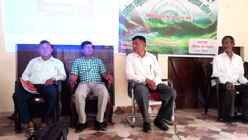 बारा । डिभिजन वन कार्यालय बाराद्वारा उपभोक्ता समुहहरुकोलागी अभिलेख तथा लेखा व्यवस्थापन सम्बन्धि दुई दिने तालिम चैत्र २९ गते विहिबार सुरु भएको छ । डिभिजन वन निमित्त अधिकृत बिरेन्द्रप्रसाद यादवको सभा अध्यक्षता भएको सो तालिमको प्रमुख अथिती भने निजगढ नगरपालिका वडा नम्बर ८ का वडा अध्यक्ष स्वर्ण लामा रहेका थिए । सामुदायिक वन उपभोक्ता महासंघ (फेकोफन) निजगढ नगर उपाध्यक्ष धनबहादुर खुलालले कार्यक्रमको व्यानर पढेर उदघाटन गरेका थिए । सो तालिममा बारा सिभिजन शाखा अधिकृत मुनीप्रसाद यादव, निजगढ नगरपालिका वडा नम्बर ८ का वडा सदस्य शालिकराम ढुंगाना, विहिबारको लेखा प्रशिक्षक श्याम उदय ठाकुर, निजगढ सव डिभिजन वन अधिकृत रघुनाथ दासलगायतका अतिथिहरुले अतिथिको ग्रहण गरेका थिए । कार्यक्रममा डिभिजन वन निमित्त अधिकृत बिरेन्द्रप्रसाद यादव, निजगढ फेकोफन उपाध्यक्ष धनबहादुर खुलाल, बारा सिभिजन शाखा अधिकृत मुनीप्रसाद यादवलगायले वनमा हुनु पर्ने विधि र विधान बारे महत्त्वपूर्ण धारण राखेका थिए । शाखा अधिकृत मुनीप्रसाद यादवले स्वागत मन्तव्य राखेका कार्यक्रमको संचालन भने निजगढ सव डिभिजनका निमित्त अधिकृत निरज पोखरेलको रहेका थिए । उक्त तालिम गोष्ठीमा बारा जिल्लाका विभिन्न सामुदायिक वन उपभोक्ता समुहका प्रतिनिधित्वगरि ४१ ओटा सामुदायिक वनको समितिहरुको सहभागीता रहेका थिए । तालिम निजगढ नगरपालिका वडा नम्बर ८ स्थित बकैया नागमणी सामुदायिक वन उपभोक्ता सनुहको सभा हल सन्चालन भैइरहेको छ । सो बैकैया नागमणी सामुदायिक वन वाराको निजगढको भमरा निजगढ सव डिभिजन वन अन्तर्गत पर्दा छ ।