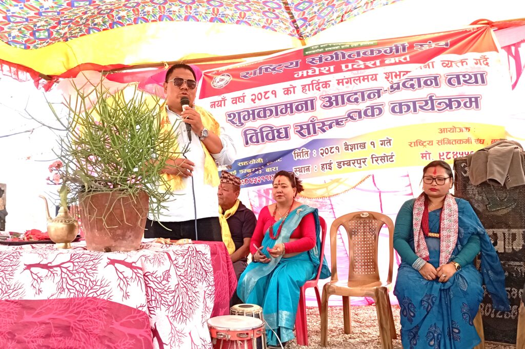 डम्बरपुर । बाराको निजगढ नगरपालिका वडा नम्बर १३ का वडा अध्यक्ष सुर्य घलानले स्थानीय कलाकारहरु आफ्नो प्राथमिकता रहेको बताएको छ । नयाँ वर्ष २०८१ को पावन अवसरमा बारा संगीत कर्मी संघद्वारा हाई डम्बरपुर रिसोर्टमा आयोजित कार्यक्रममा आफ्नो मन्तव्य व्यक्त गर्दै अध्यक्ष घलानले यस्तो बताएको हो । उक्त कार्यक्रममा वडा अध्यक्ष घलानले बारामा जन्मिएर विविधि क्षेत्रमा स्थापित स्रष्टा, कलाकार र खेलाडीलाई आफुले सधै सम्मान र सयोग गरेको र अझै सहयोग गर्ने बताए । अध्यक्ष घलानले बाराको दुर्गम क्षेत्र वडा नम्बर १३ र बाराको उत्तरी क्षेत्रका नगरपालिकाले कलाकार, पत्रकार र राष्ट्रिय खेलाडी पाउँदा आफुलाई गर्व महसुस भएको बताए । उनले भने, ‘उहाँहरूले स्थानीय क्षेत्रका कलाकर्मीहरुलाई अझै साथ र सपोट्मा एक इन्च पनि कमी नगर्ने बताए । अध्यक्षले थप्दै भने आगामी दिनमा उहाँहरू आफू जन्मेको ठाउँको विकासका लागि योगदान गर्नुहुनेछ भन्ने आशा गरेको छु ।’ घलानले यस्तो कार्यक्रम सुरुवात मात्र भएको र आगामी वर्षदेखि निरन्तरता पाउनेमा जानकारी दिए । सिताकुमारी डिसी दुरुङ्ग च्याङ्गको अध्यक्षतामा भएको कार्यक्रममा प्रमुख अतिथिको असनलाई सम्बोधन गर्दै वडा अध्यक्ष घलानले उक्त कुरा व्यक्त गरेका थिए । मधेस प्रदेश वरिष्ठ उपाध्यक्ष बद्री राउत समेत उपस्थियी रहेको सांस्कृतिक कार्यक्रममा विशिष्ट अतिथि र अथितिहरु निजगढ-१३ का वडा सदस्य दिपक न्यौपाने, संगीतकर्मी संघकी सल्लाहकार सुनमाया लोप्चन, रामकुमारी गोले, तनुजाकुमारी लो, हर्कबहादुर घलानलगायतका अतिथिहरुको उपस्थिति रहेका थिए । त्यस्तै गायक तथा गायिकाहरुमा पुरुषोत्तम मगर, लोकगायक बद्री राउत, गायक संगितकर्मीका सचिव विवेक बस्नेत र्हएका छन भने कलाकार तथा गायक/गायिकाहरुमा अमृत थापा, बिभामाया मगर, अम्विका सिग्देल, सुनमाया लोप्चन, भिमप्रसाद आचर्य, ओमनाथ आचर्य र शंखर राउत रहेका छन । सहभागी कलाकारहरूले आ-आफ्न गीतहरू म्युजिक ट्र्याकबाट रमाईला रमाईला गित संगीत प्रस्तुत गरेका छ्न ।