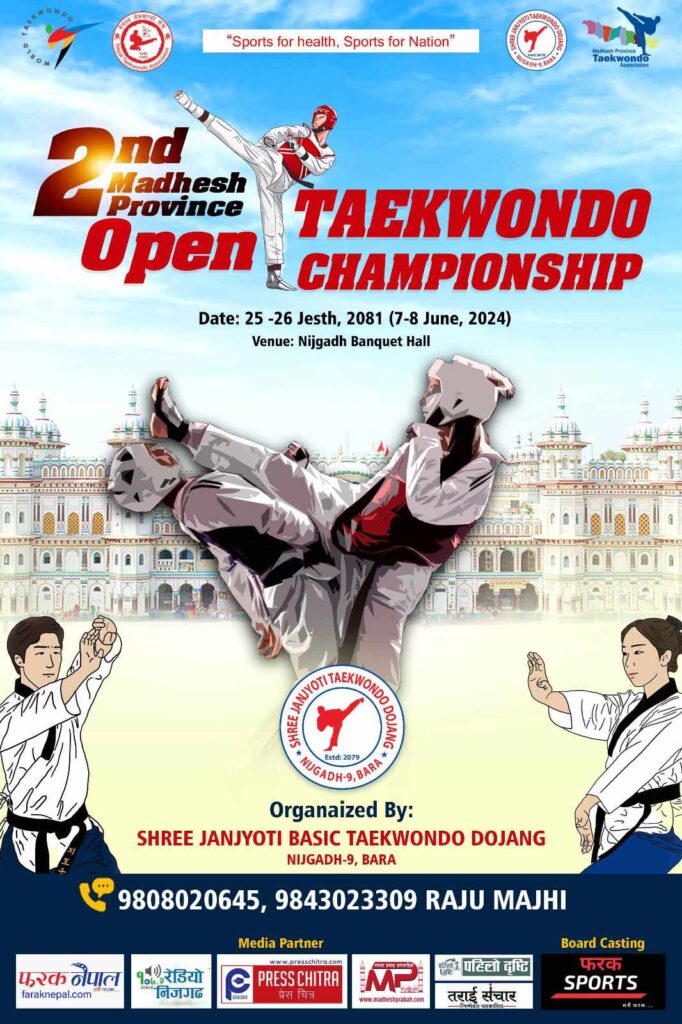 उमेश घलान/बारा । बाराको निजगढ नगरपालिकाको बैंक्युइट हलमा जेष्ठ २५ गते देखि दोस्रो मधेस प्रदेशस्तरीय खुल्ला तेक्वान्दो प्रतियोगिता हुने भएको छ । प्रतियोगिता निजगढ ९ जनज्योति डोजङ्ग तेक्वान्दो क्लबले आयोजना गरेको हो । जनज्योति डोजङ्गले जेष्ठ २५ र २६ गते उक्त प्रतियोगिता संचालन गरिने भएको छ ।