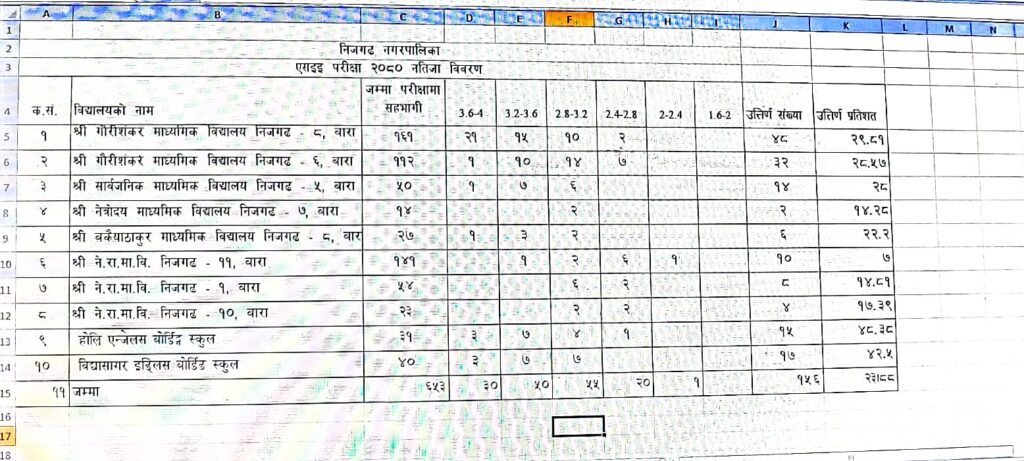 बारा । यस वर्षको एसईई परीक्षामा निजगढ नगरपालिकाभित्रका सामुदायिक विद्यालयहरु र संस्थागत विद्यालयहरुको परीक्षाफल अपेक्षाकृत कमजोर देखिएको छ । अघिल्ला वर्षहरुमा उत्कृष्ट रिजल्ट निकाल्दैआएको निजगढ ८ स्थित गौरीशंकर माविबाट यो वर्ष ३० प्रतिशत विद्यार्थीमात्रै उतिर्ण भएका छन । सो विद्यालयबाट ‘प्लस ए’ मा उतिर्ण हुने विद्यार्थीको संख्यामा भने विगतको तुलनामा निक्कै सुधार आएको छ । विद्यालयबाट यस वर्ष २१ जना विद्यार्थी ‘प्लस ए’ मा उतिर्ण भएका छन । जसमा १६१ विद्यार्थी सहभागी भएकामा ४८ जना मात्र उतिर्ण सफल भए । निजगढ ११ को नेरामावि रतनपुरीको परीक्षाफल पनि कमजोर नै देखिएको छ । त्यस्तैगरी रतपुरीका १३८ मध्ये १० जना उतिर्ण हुन सफल भएका छन । त्यसैगरी निजगढ ५ स्थित सार्वजनिक माविको परीक्षाफल पनि उस्तै देखिएको छ । जम्मा ५० जना सहभागी उक्त विद्यालयबाट यस पटक २८ प्रतिशत विद्यार्थीहरुमात्रै उर्तिण भएका छन । सो विद्यालयबाट १ जना विद्यार्थी ‘ए प्लस’ मा उतिर्ण भएका छन भने ए ग्रेडमा ७ र ‘बि प्लस’ मा ६ जना विद्यार्थी उर्तिण भएका छन जम्म १४ जना मात्र उतिर्ण सफल भएका छन । निजगढ ६ स्थित गौरीशंकर माविबाट पनि ‘ए प्लस’ मा १ जनासहित २९ प्रतिशत विद्यार्थी उतिर्ण भएका छन । सो विद्यालयबाट ए मा १०, ‘बि प्लस’ मा १४ र बि मा ८ जनागरी ३२ जना विद्यार्थी उतिर्ण सफल भएका हुन । गौरीशंकर सडकटोलबाट ११२ जना विद्यार्थी परीक्षामा सहभागी भएका थिए । उता, एसईई परीक्षामा पहिलो पटक सहभागी भएको निजगढ ८ स्थित बकैया ठाकुर माविबाट भने २३ प्रतिशत विद्यार्थी उतिर्ण भएका छन । सो विद्यालयबाट ‘ए प्लस’ मा १ जनासहित ए मा २, ‘बि प्लस’ मा २ र बि मा १ जना उतिर्ण हुन सफल भएका हुन जसमा २७ जना विद्यार्थी सहभागी भएका थिए भने जम्म ६ उतिर्ण भएका छन । त्यसैगरी नेत्रोदय मावि योजनाटोलबाट १४ जना विद्यार्थीमध्ये २ जनामात्रै उर्तिण भएका छन । उता, निजगढ १० लालस्थित नेरामाविबाट जम्मा १७ प्रतिशत विद्यार्थीमात्रै उर्तिण भएका छन । परीक्षामा सहभागी २३ जना विद्यार्थी मध्ये ‘बि प्लस’ मा २ र “वी मा २ जनागरी ४ जना उणिर्ण भएका छन । त्यसैगरी निजगढ १ स्थित नेरामावि सिंगौलमा १५ प्रतिशत उतिर्ण भएका छन । ५४ जना विद्यार्थी सहभागी भएकोमा ८ जना मात्र उतिर्ण भएका हुन । राष्ट्रिय परीक्षा बोर्डले एसईई परीक्षाको नतिजा बिहीवार बिहान सार्वजनिक गरेको हो । यस वर्षको एसईई परीक्षामा निजगढ नगरपालिकाभित्रका सामुदायिक विद्यालयहरुको परीक्षाफल अपेक्षाकृत कमजोर देखिएको छ । अघिल्ला वर्षहरुमा उत्कृष्ट रिजल्ट दिदैआएको विद्यालयहरुको पनि अबस्था कमजोर नै देखिएको छ । त्यस्तै संस्थागत विद्यालयहरुमा पनि अपेक्षा अनुसार नतिजा खसै आउन सकेन । होलि उन्जेल्