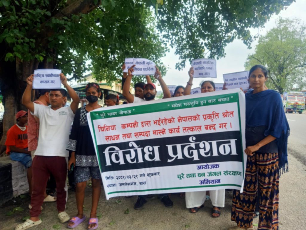 बारा । चिनियाँ कम्पनीले विकासको नाममा मधेसको लाईफ लाईनमा सिरहा सप्तरी जिल्लाको महेन्द्र राजमार्ग बनाउने बहानामा नियमित हिसाबले चुरे पहाडको विनाश गर्दै आईरहेको भन्दै अमलेखगंजमा चुरे तथा वन जंगल संरक्षण अभियानद्वारा चिनियाँ कम्पनी विरुद्ध विभिन्न नाराका साथ विरोध प्रर्दशन गरेको छ ।