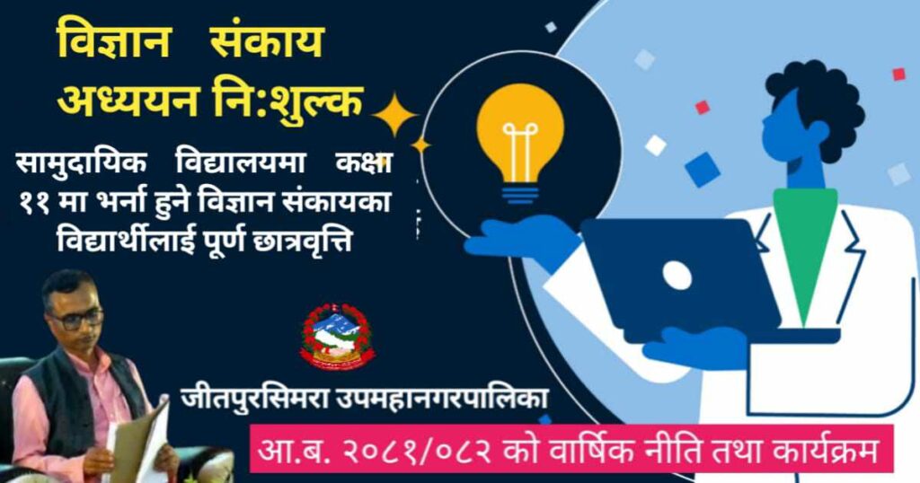 बारा/महेन्द्र सहनी । बाराको जीतपुरसिमरा उपमहानगरपालिकाले उपमहानगरभित्रका सामुदायिक विद्यालयमा विज्ञान संकाय पढ्ने विद्यार्थीलाई पूर्ण छात्रवृत्ति प्रदान गर्ने नीति ल्याएको छ ।