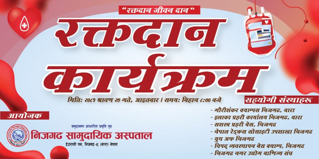 बारा । बाराको निजगढ ९ मा रहेको प्रसुतीमा आधारित निजगढ सामुदायिक अस्पतालले भोलि आईतवार रक्तदान कार्यक्रम आयोजना गर्ने भएको छ । कार्यक्रममा अस्पतालका तर्फबाट रक्त विशेषज्ञ डाक्टरसहितको नर्सिङ तथा मेडिकल टिम खटिनेछ । रक्तदानकालागि आवश्यक सामग्रीहरु अस्पतालले उपलब्ध गराउनेछन् । प्राविधिकका लागि विरगन्ज रक्तसंचारको टोलि समेत आउने भएको छ । निजगढ ९ देउराली पथ कार्यालय भवनमा हुने रक्तदान कार्यक्रममा स्थानीयहरुले रक्तदान गर्ने छन् । रगतको अभाव हुन लागेको सामाजिक संजालमा आउन थालेपाछी अस्पताले रक्तदानको कार्यक्रम आयोजना गरिएको अस्पताल संचालक समितीका अध्यक्ष माधव न्यौपानेले मधेस प्रवाहलाई जानकारी दिएका थिए ।