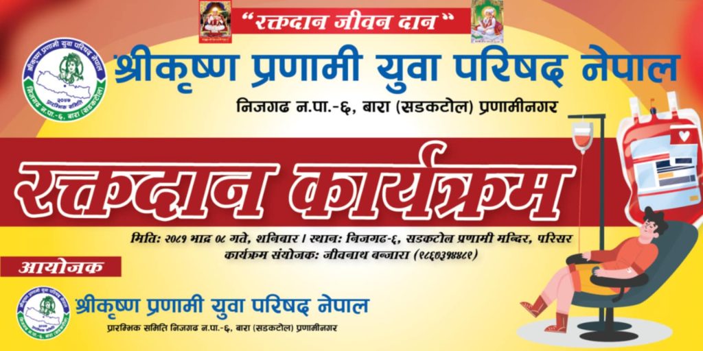 बारा । श्री कृष्ण प्राणामी युवा परिषद नेपालले सम्पदा सांस्कृतिक सम्पदाको परिचय प्रवर्द्धनका साथै रक्तदान गरौँ भन्ने सचेतनाको विकासका लागि रक्तदान कार्यक्रम आयोजना गर्ने भएको छ ।