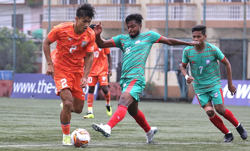 ललितपुरकाे सातदाेबाटाेमा रहेकाे एन्फा कम्प्लेक्स मैदानमा भएकाे दाेस्राे सेमिफाइनलमा बङ्गलादेशले भारतलाई ४–३ ले हरायाे । निर्धारित ९० मिनेटकाे समयमा १–१ गाेलकाे बराबरी भएपछि खेल पेनाल्टी शुटआउटमा पुगेकाे थियो ।