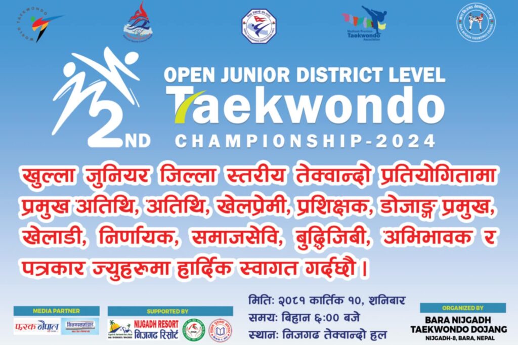 निजगढ तेक्वान्दो डोजाङद्वारा आयोजित दोश्रो जुनियर जिल्ला स्तरीय खुल्ला  तेक्वान्दो प्रतियोगिता भोलि कात्तिक १० गते