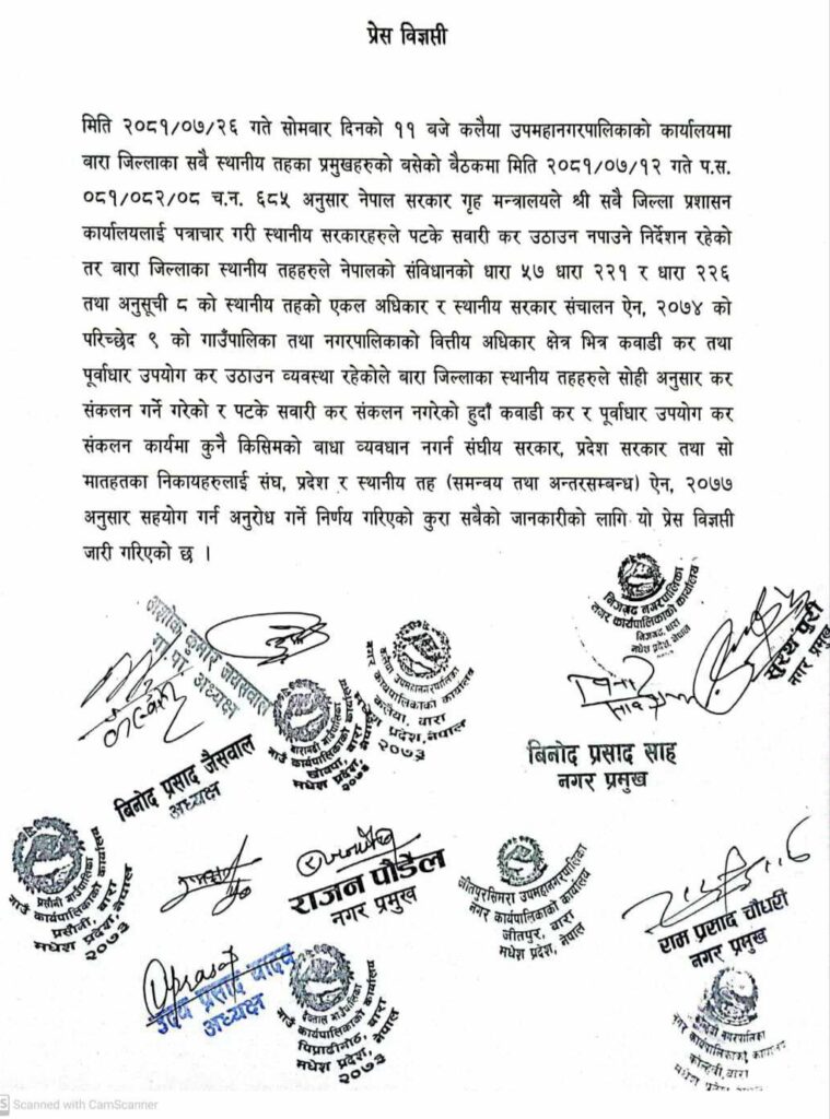 बारा । बाराका स्थानीय तहहरुले संविधानले प्रदान गरेको अधिकारअनुसार कबाडी कर र पूर्वाधार उपयोग कर संकलन गरेको बताएका छन् । बाराको निजगढ नगरपालिकाका प्रमुख सुरथ पुरी, जीतपुरसिमराका राजन पौडेल, कलैया उपमहानगरपालिका मेयर विनोद साह र कोल्हबी नगरपालिकाका प्रमुख रामप्रसाद चौधरी, बरियारपुर नगरपालिकाका प्रमुख उपेन्द्रप्रसाद यादव तथा प्रसौनी गाउँपालिकाका अध्यक्ष विनोद प्रसाद जैसवाल र करैयामाई गाउँपालिका अध्यक्ष बुधवार संयुक्त विज्ञप्ति जारी गर्दै स्थानीय तहहरुले पटके कर नभई गाउँपालिका तथा नगरपालिकाको वित्तीय अधिकार क्षेत्रभित्र कवाडी कर तथा पूर्वाधार उपयोग कर संकलन गरेको जानकारी गराएका हुन । कलैया उपमहानगरपालिकाको कार्यालयमा कात्तिक २६ गते बारा जिल्लाका सबै स्थानीय तहका प्रमुखहरुको बैठकले संविधानले प्रदान गरेको अधिकार अनुसार कवाडी कर र पूर्वाधार उपयोग कर संकलन गरिएको साझा धारणा बुधवार सार्वजनिक गरेका हुन ।