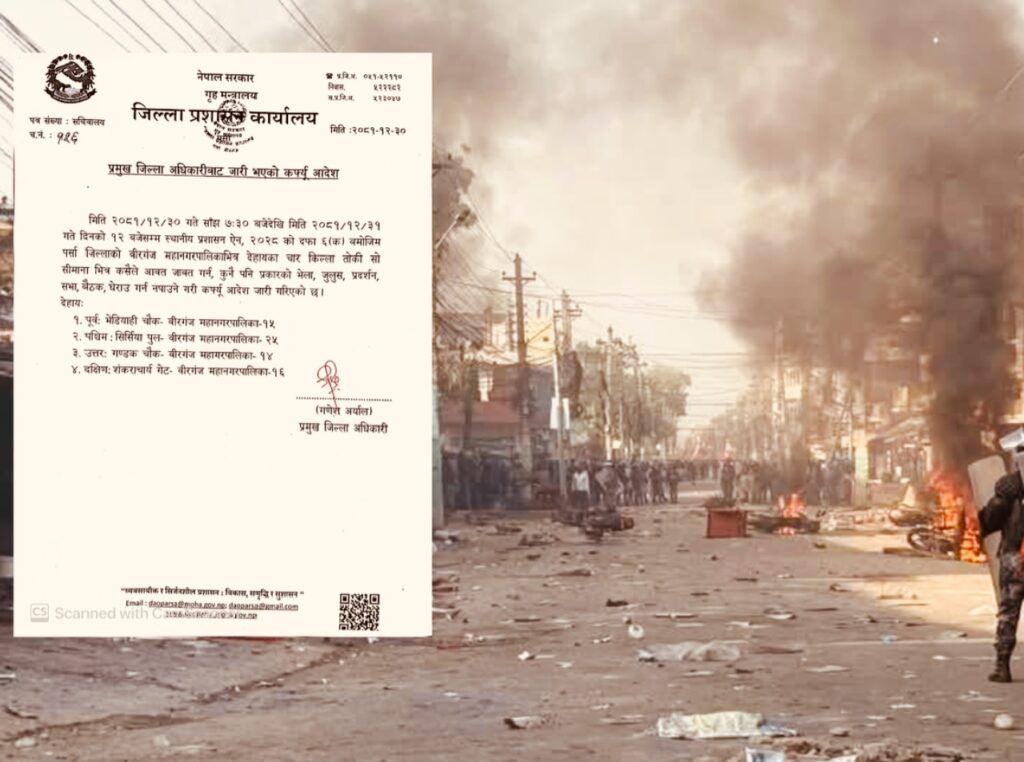 विजेन्द्रकुमार चौधरी/बारा । पर्साको वीरगञ्जमा कर्फ्यु लगाइएको छ । शनिबार दिउँसो हिन्दू र मुस्लिम समुदायबीच झडप हुँदा वीरगञ्जको अवस्था तनावग्रस्त बनेको थियो ।अवस्था तनावग्रस्त बनेपछि अहिले प्रशासनले कर्फ्यु जारी गरेको छ ।