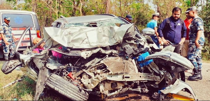 बारा । पुर्व पश्चिम राजमार्ग पथलैया–निजगढ सडकखण्डको १३ किलोमा आज शुक्रबार दिउँसो टिपरले कारलाई ठक्कर दिदा भएको सवारी दुर्घटनामा दुई जनाको ज्यान गएको छ । जिल्ला प्रहरी कार्यालय बाराका अनुसार ज्यान गुमाउनेमा सर्लाही बरथवा नगरपालिका १५ हजरियाका ४६ वर्षीय नारायण हरी शर्मा र कार चालक सर्लाही सुन्दरपुर चोहवा ४ घर भएका वर्ष ५० का जीत नारायणप्रसाद साह रहेका छन । जीतपुरसिमरा उपमहानगरपालिका १६ स्थित भूईपुल नजिकको क्षेत्रमा कार र ट्रिपर एकआपसमा ठोक्किएर दुर्घटना भएको थियो । प्रहरीका अनुसार निजगढबाट पथलैयातर्फ जादै गरेको प्र २–०३–००१ ख ०६०७ नम्बरको ट्रिपर र पथलैयाबाट निजगढतर्फ आउदै गरेको बा ०१–०२५ च ५०७६ नम्बरको कार दिउसो २ः ५५ बजे एकआपसमा ठोक्किएर दुर्घटना भएको हो । दुर्घटनालगत्तै कारमा सवार दुई जनालाई निजगढस्थित अस्पताल ल्याइएको भएपनि चिकित्सकले उनीहरुलाई मृत घोषणा गरेका थिए । प्रहरीका अनुसार ट्रिपर चालक फरार छन् । ट्रिपर सडक छेउमा पल्टिएको छ भने कारको अगाडिको भाग पूर्णरुपमा क्षतिग्रस्त भएको छ ।