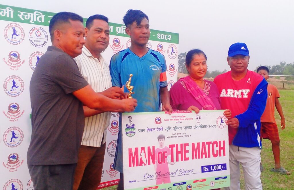 सो खेलको म्यान अफ दि म्याच पनि समीर कुमरले नै हात पारेका छन । उत्कृष्ट खेलाडी कुमरलाई वडा नम्बर ४ का वडा सदस्य सगर गौतम, समाजसेवी बेनि मोक्तान र स्व. विकल रेग्मीकी आमा कमला रेग्मीले १ हजार नगद र ट्रफी प्रदान गरेका थिए ।
