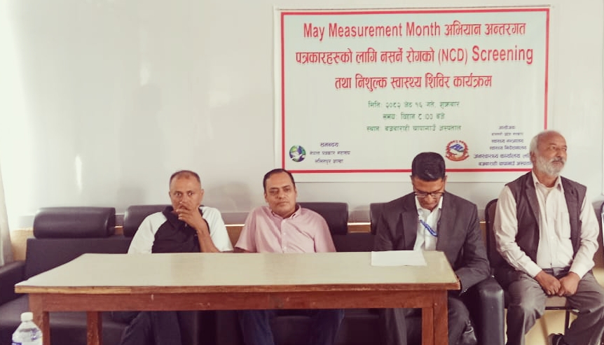 स्वास्थ्य शिविरमा विभिन्न नसर्ने राेगहरूकाे परिक्षण, भिडियाे एक्सरे, मुटु तथा मृर्गाैला परिक्षण, आँखा, दन्त, मधुमेह, आरएफटि, एलएफटि, सिबिसी, स्त्री लगायत राेगकाे निःशुल्क परीक्षण गरिएकाे थियाे । शिविरमा ६० वर्ष नाघेका पत्रकारलाई निःशुल्क चश्मा वितरण गरिएकाे थियाे ।