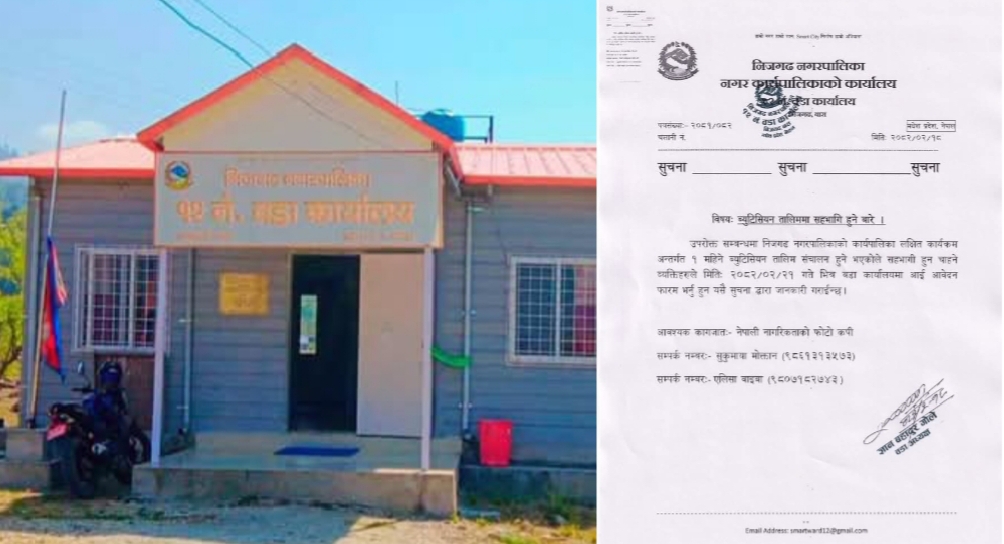नगरपालिकाको कार्यपालिका लक्षित कोष कार्यक्रमअन्तर्गत १ महिनाको अवधि रहेको तालिममा सहभागिता जनाउन इच्छुक महिलाहरूले यही जेठ २१ गतेभित्र वडा कार्यालयमा सम्पर्क गरी आवेदन फारम बुझाउन सकिने छ ।