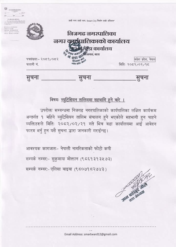सहभागीता र तालिमको बारेमा बुझ्नको लागि वडा कार्यालयका प्रतिनिधि सुकुमाया मोक्तान र एलिसा वाइबालाई सम्पर्क गर्ने सकिन () संग सम्पर्क गर्न सकिने वडाले जनाएको छ। सुकुमाया, ९८६९१२७३५७, एलिसा, ९८०७२८७३४३ मा जानकारी लिन सक्ने छन ।