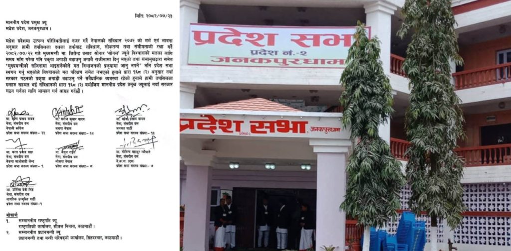 विजेन्द्र चौधरी/जनकपुरधाम । मधेश प्रदेशमा राजनीतिक अस्थिरता कायम रहेको अवस्थामा प्रदेशका विभिन्न दलहरूले नयाँ सरकार गठनको प्रक्रिया अघि बढाउन प्रदेश प्रमुख कृष्ण प्रसाद यादवलाई औपचारिक रुपमा अनुरोध गरेका छन् ।