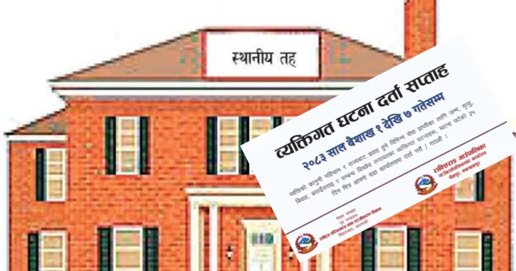 मकवानपुर । राक्सिराङ गाउँपालिकाले ‘व्यक्तिगत घटना दर्ता सप्ताह’ सञ्चालनमा ल्याएको छ । २०८३ साल वैशाख १ गतेदेखि ७ गतेसम्म सञ्चालन हुने यस अभियानमार्फत जन्म, मृत्यु, विवाह, बसाइँसराइ तथा सम्बन्ध विच्छेद जस्ता घटनाहरू समयमै दर्ता गर्न स्थानीय तहले आग्रह गरेको हो ।