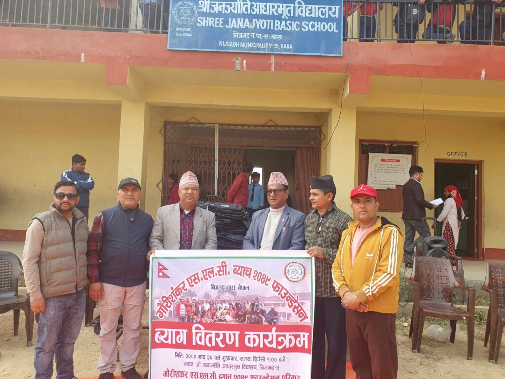 बारा । बाराको निजगढ नगरपालिका वडा नम्बर ९ जनज्योति आधारभुत विद्यालयका विद्यार्थिहरुलाई गौरीशंकर ४९ एसएलसी व्याच फाउन्डेसनले विद्यालय झोला वितरण गरेको छ ।